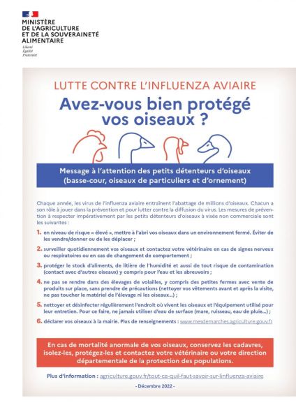 Je vous demande de bien vouloir diffuser largement le document ci-joint, édité par le Ministère de l’Agriculture, de l'Agro-alimentaire et de la Souveraineté Alimentaire, à tous les administrés de votre commune détenteurs d’une basse-cour, éventuellement via le bulletin municipal.